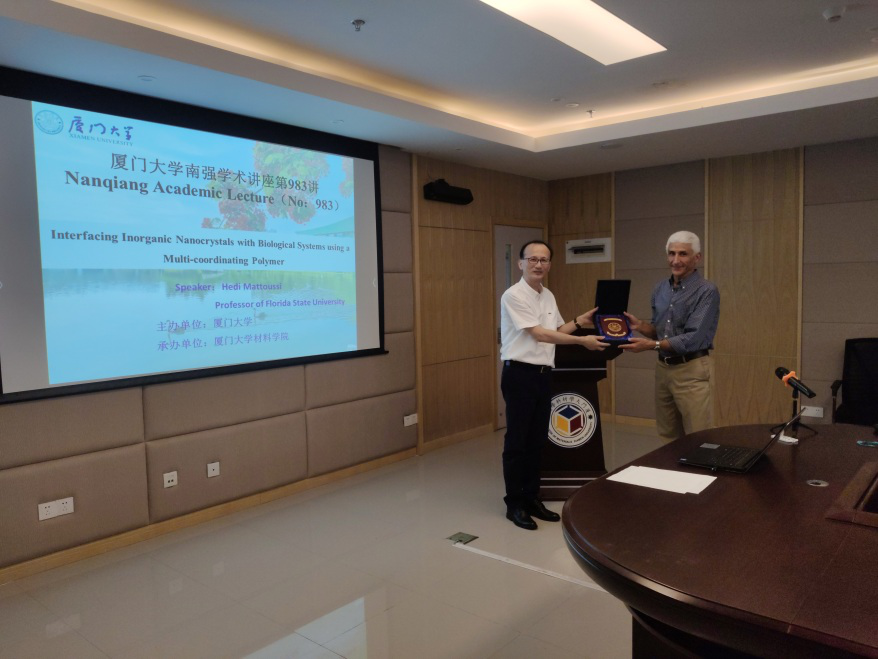 2019年7月12日-14日,美国佛罗里达州立大学化学系Hedi Mattoussi教授应邀到访福建省涂层材料分院交流讲学。12日上午,在材料学院圣诺楼308会议厅,Hedi Mattoussi教授做客南强学术讲座(第983讲),做了题为“Interfacing Inorganic Nanocrystals with Biological Systems using a Multi-coordinating Polymer”的学术报告。涂层材料分院戴李宗教授主持为其颁发了南强学术讲座纪念章。